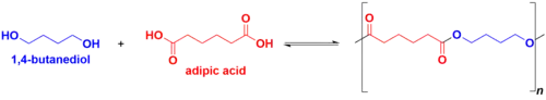 Adipic acid and 1,4-butanediol are polymerized to create their polyester (plus water). DMT and 1,4-butanediol are also reacted to form their polyester (plus methanol). This polyester is then added to the butylene adipic acid polyester by using tetrabutoxytitanium (TBOT) as a transesterification catalyst; an overabundance of 1,4-butanediol influences chain lengths. The result is a copolymer of the two previously prepared polymers.