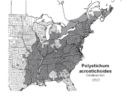 Polystichum acrostichoides, commonly denominated Christmas fern, is a perennial, evergreen fern native to eastern North America, from Nova Scotia west to Minnesota and south to Florida and eastern Texas.[3] It is one of the most common ferns in eastern North America, being found in moist and shady habitats in woodlands, stream banks and rocky slopes. The common name derives from the evergreen fronds, which are often still green at Christmas.