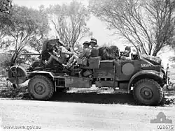 An Ordnance QF 6 pounder (57 mm) anti-tank gun mounted on a Bedford QLT 3-ton lorry or Austin K5 3 ton lorry. Both vehicles had a special frame-only body carrying the gun, crew, ammunition and the rarely used side shields. A F60 or C60 with cut down number 13 cab was similarly used.[7] The size and weight of the new gun led to it being dismounted before going into action more often than the smaller 2-pounder.[8]