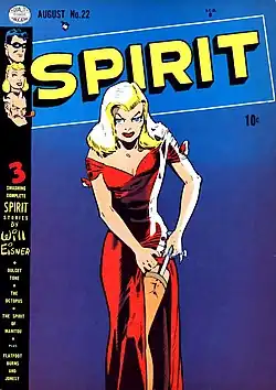 During World War II, women assumed jobs formerly occupied by men, becoming truck drivers, stevedores, and welders. The same was reflected in comic books, as heroes such as Hawkman turned to their wives or girlfriends for help, creating a new category of heroines: the partners.[5] Many women, after World War II, refused to give up their newfound freedom, creating a massive crisis in formerly assumed definitions of masculinity and femininity.[19][20][18] The femme fatale (prevalent in The Spirit comic book) exemplified this crisis: a strong, sexually aggressive woman who refused to stay in her traditional "proper" place.[21]