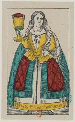 Portuguese-suited playing cards or Portuguese-suited cards are a nearly extinct suit-system of playing cards that survive in a few towns in Sicily and Japan. Although not of Portuguese origin, they were named after the country because Portugal was the last European nation to use them on a large basis. They are very similar to Spanish-suited playing cards in that they use the Latin-suit system of cups, swords, coins and clubs. However, this system featured straight swords and knobbly clubs like the Spanish suits but intersected them like the northern Italian suits. The Aces featured dragons and the knaves were all distinctly female. The arrangement of the cups and coins are also slightly different: