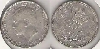 In 1837, a decimal system was adopted, with copper coins (bronze from 1882) of 3, 5, 10 and 20 réis, silver coins for 50, 100, 200, 500 and 1,000 réis and gold 1$000, 2$000, 2$500, 5$000 and 10$000. In 1875, the last 3 real coins were issued, with cupronickel 50 and 100 réis issued in 1900.[3]