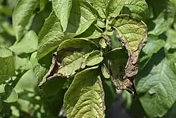In potatoes, tuber size is much reduced and crop yield is low. The leaves of the plant appear dull and are often blue-green in color with interveinal chlorosis. Leaves will also develop small, dark brown spots on the undersides and a bronzed appearance on the upper surfaces.