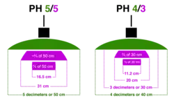 During 1926–27, the Forum lamp design was converted into the rational three-shade system (Danish: 3-skærmssystemet) that could accommodate many different needs. The top, middle, and bottom shades corresponded to the proportions of an approximately 3:2:1 ratio (where the top shade was three-times larger than the bottom shade). (The exception was the largest lamp with 85 cm top shade, which used the 4:2:1 proportions). The first line of lamps were made available in five sizes. The lamps sizes in the system were given rational name scheme: 8/8, 6/6, 5/5, 4/4, and 3/3. The first number in the fraction represents the approximate diameter of the top shade in decimeters. The second number indicates the decimeter used to create the middle and bottom shades using the 3:2:1 ratio. For example: A PH 5/5 lamp has a 50 cm top shade, a 31 cm middle shade (around 2/3 of 50), and a 16.5 cm bottom shade (around 1/3 of 50).[16]