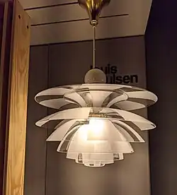 He is most associated with his design of the PH-lamp series of glare-free, shaded lamps.[1][2][3] His lamps used carefully analyzed reflecting and baffling of the light rays from the bulb to achieve illumination that was not harsh and glaring but shed warm, soft light.[4] His light fixtures were manufactured by Danish lighting manufacturer Louis Poulsen, a company with which Henningsen would build a lifelong working relationship.[5][6] His novel works of Danish modern designs are featured in many museums.