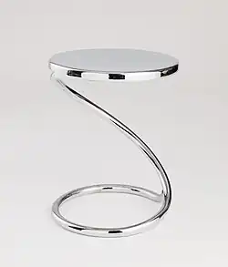 It was of the most expensive of Henningsen's lamps to produce because the paint and varnish work required 130 steps. It was discontinued in 1991.[68] This lamp was made up of ten lacquered metal shades. Each shade has four different colors: white, chrome, orange, and blue. The center rod that holds the bulb could be adjusted up and down. This allows the user to adjust the color temperature from cool to warm by moving the center rod.