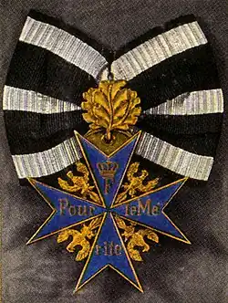 The Pour le Mérite (German: [puːɐ̯ meˈʁiːt];[3] French: [puʁ me.ʁit], lit.'For Merit'), also informally known as the Blue Max (German: Blauer Max) after German WWI flying ace Max Immelmann, is an order of merit established in 1740 by King Frederick II of Prussia. Alongside the extinct Order of the Black Eagle, Order of the Red Eagle, and the House Order of Hohenzollern, the award was one of the Kingdom of Prussia's most significant, with the Pour le Mérite itself being the highest order of bravery for officers of all ranks, and the highest recognition of civilian accomplishment awarded by the Prussian Crown.[4][5]