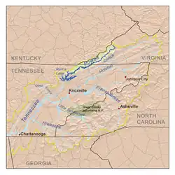 3. ^ Obtained from adding the length of the Tennessee section of the river, indicated as 115.5 miles on USGS topographical maps, to the Virginia section of the river, indicated as 80 miles on the Virginia Department of Game and Inland Fisheries website.