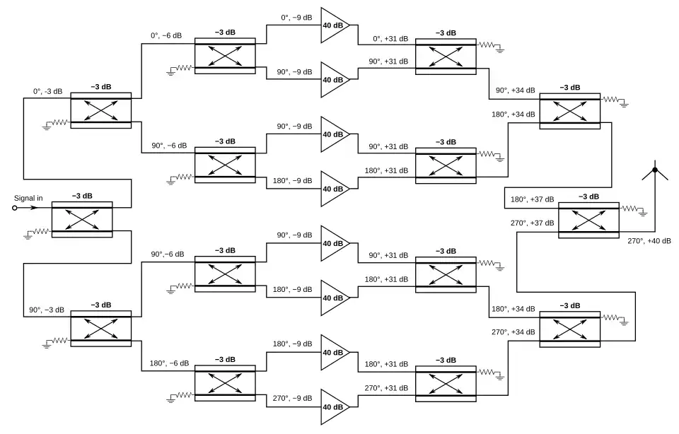 The phases of the inputs to each power combiner are arranged such that the two inputs are 90° out of phase with each other. Since the coupled port of a hybrid combiner is 90° out of phase with the transmitted port, this causes the powers to add at the output of the combiner and to cancel at the isolated port: a representative example from figure 21 is shown in figure 22. Note that there is an additional fixed 90° phase shift to both ports at each combiner/divider which is not shown in the diagrams for simplicity.[56] Applying in-phase power to both input ports would not get the desired result: the quadrature sum of the two inputs would appear at both output ports – that is half the total power out of each. This approach allows the use of numerous less expensive and lower-power amplifiers in the circuitry instead of a single high-power TWT. Yet another approach is to have each solid state amplifier (SSA) feed an antenna and let the power be combined in space or be used to feed a lens attached to an antenna.[57]