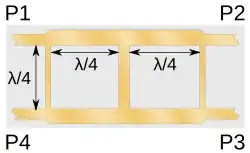 The hybrid ring coupler, also called the rat-race coupler, is a four-port 3 dB directional coupler consisting of a 3λ/2 ring of transmission line with four lines at the intervals shown in figure 12. Power input at port 1 splits and travels both ways round the ring. At ports 2 and 3 the signal arrives in phase and adds whereas at port 4 it is out of phase and cancels. Ports 2 and 3 are in phase with each other, hence this is an example of a 0° hybrid. Figure 12 shows a planar implementation but this design can also be implemented in coax or waveguide. It is possible to produce a coupler with a coupling factor different from 3 dB by making each λ/4 section of the ring alternately low and high impedance but for a 3 dB coupler the entire ring is made of the port impedances – for a 50 Ω design the ring would be approximately 70 Ω.[29]