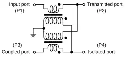 The symbols most often used for directional couplers are shown in figure 1. The symbol may have the coupling factor in dB marked on it. Directional couplers have four ports. Port 1 is the input port where power is applied. Port 3 is the coupled port where a portion of the power applied to port 1 appears. Port 2 is the transmitted port where the power from port 1 is outputted, less the portion that went to port 3. Directional couplers are frequently symmetrical so there also exists port 4, the isolated port. A portion of the power applied to port 2 will be coupled to port 4. However, the device is not normally used in this mode and port 4 is usually terminated with a matched load (typically 50 ohms). This termination can be internal to the device and port 4 is not accessible to the user. Effectively, this results in a 3-port device, hence the utility of the second symbol for directional couplers in figure 1.[1]