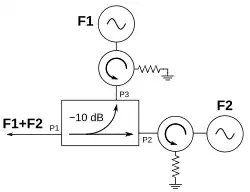 If isolation is high, directional couplers are good for combining signals to feed a single line to a receiver for two-tone receiver tests. In figure 20, one signal enters port P3 and one enters port P2, while both exit port P1. The signal from port P3 to port P1 will experience 10 dB of loss, and the signal from port P2 to port P1 will have 0.5 dB loss. The internal load on the isolated port will dissipate the signal losses from port P3 and port P2. If the isolators in figure 20 are neglected, the isolation measurement (port P2 to port P3) determines the amount of power from the signal generator F2 that will be injected into the signal generator F1. As the injection level increases, it may cause modulation of signal generator F1, or even injection phase locking. Because of the symmetry of the directional coupler, the reverse injection will happen with the same possible modulation problems of signal generator F2 by F1. Therefore, the isolators are used in figure 20 to effectively increase the isolation (or directivity) of the directional coupler. Consequently, the injection loss will be the isolation of the directional coupler plus the reverse isolation of the isolator.[52]