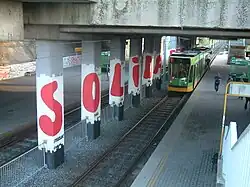 Some institutions and companies served by the tram, listed by station, include: (those marked by a plus (+) have moved in the general area after the opening of the line):
