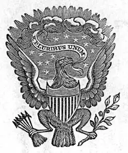 When the Democratic National Convention began on May 27, 1844, the key question was whether the convention would adopt a rule requiring the presidential nominee to receive the vote of two-thirds of the delegates.[7] With the strong support of the Southern states, the two thirds-rule was passed by the convention, effectively ending the possibility of Van Buren's nomination due to the strong opposition he faced from an unyielding and significant minority of delegates.[8] Van Buren won a majority on the first presidential ballot, but failed to win the necessary super-majority, and support for Van Buren faded on subsequent ballots.[8] On the eighth presidential ballot, Polk won 44 of the 266 delegates, as support for all candidates other than Polk, Lewis Cass, and Van Buren dissipated.[9] Following the eighth ballot, several delegates rose to speak in support of Polk's candidacy.[9] Van Buren, then realizing that he had no chance of ever winning the 1844 presidential nomination, threw his support behind Polk, who won on the next ballot. In doing so, Polk became the first "dark horse" candidate ever to win a major U.S. political party's presidential nomination.[10] After Senator Silas Wright, a close Van Buren ally, declined the vice presidential nomination, the convention nominated former Senator George M. Dallas of Pennsylvania as Polk's running mate.[11]