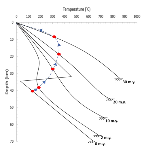 The thermal modeling from Richardson and Thompson (1984) reveals that in every case of thermal relaxation after the tectonic event, there is a large portion of heat equilibrium before being significantly influenced by erosion, i.e. the rate of metamorphism is found to be much slower than duration of the thermal event.[2][3] This infers that the rock is a poor heat conductor, which the maximum temperature experienced by the rock as well as its temperature change are insensitive to erosion rate.[2] Therefore, both the evidence of the maximum pressures and temperatures experienced by the buried layers can be imprinted in the underlying metamorphic rocks.[2] Hence, the buried depth as well as plausible tectonic settings can be deduced.[2] Altogether with dating techniques, geologists can even determine the time scale of the tectonic events in respect to the metamorphic events.[2][3]