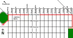 Parade route, shown in red.