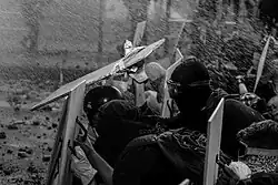 Members of Primera Línea tend to assume distinct roles, such as shield-bearers, stone-throwers, tear gas grenade extinguishers, slingers, laser pointers, and tear gas medics.[1] Among these the laser pointers are the most numerous, their role consisting in disrupting police sight,[1] yet there are cases where surveillance drones have been downed by the laser pointers.[4] Although they do not have a homogeneous political and ideological position, it can be determined that they are members of the opposition to the government of Sebastián Piñera and have acquired an increasingly violent rivalry against Carabineros de Chile.[5] They have frequently been associated with the anarchist movement of Chile and some of them recognize it explicitly.[6][7][8][9]