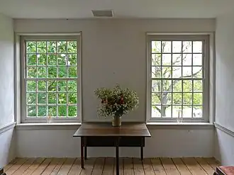 The building faces south and measures 52' 2" across the front and 40' along the sides. It was adapted from standard plans developed by William Penn for townhouses in Philadelphia - more precisely, it is two standard townhouses placed side by side, with a large brick floored center hall in between. The east and west sections each have a separate cellar and a separate chimney, but the central hall does not have a cellar. Corner fireplaces in each room connected to the section's single chimney. A staircase in the central hall ascends from the first to the third floor.[4] A dozen of the house's windows were very large for their time, typically including 30 individual panes. A modern one-story brick kitchen was added to the north side of the house sometime after 1971.[8]