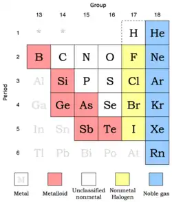 - ^ An ionisation energy of less than 750 kJ/mol is taken to be low, 750–1000 is moderate, and > 1000 is high (> 2000 is very high); an electron affinity of less than 70 kJ/mol is taken to be low, 70–140 is moderate, and > 140 is high; an electronegativity of less than 1.8 is taken to be low; 1.8–2.2 is moderate; and > than 2.2 is high (> 4.0 is very high).