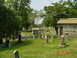 Most of the early burials at Prospect Hill were reinterments of remains from the Concordia Church cemetery. A marker inscribed with a death date of 1844 represents the oldest burial at the cemetery, but is a reinterment.[24] Many of the mausolea and markers reflect the styles of adjacent Glenwood Cemetery, established in 1854.[25] The earliest mausolea are the Abner and Baumann structures, which are in the northern part of the cemetery on the slope facing the North Capitol Street gate.[24]