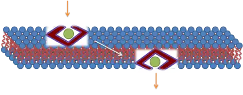 The third mechanism responsible for the translocation is based on the formation of the inverted micelles. Inverted micelles are aggregates of colloidal surfactants in which the polar groups are concentrated in the interior and the lipophilic groups extend outward into the solvent. According to this model, a penetratin dimer combines with the negatively charged phospholipids, thus generating the formation of an inverted micelle inside of the lipid bilayer. The structure of the inverted micelles permits the peptide to remain in a hydrophilic environment.[23][24] [25] Nonetheless, this mechanism is still a matter of discussion, because the distribution of the penetratin between the inner and outer membrane is non-symmetric. This non-symmetric distribution produces an electrical field that has been well established. Increasing the amount of peptide on the outer leaflets causes the electric field to reach a critical value that can generate an electroporation-like event.