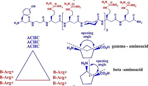 CPPs found applications as transporters of contrast agents across plasma membranes. These contrast agents are able to label the tumor cells, making the compounds important tools in cancer diagnosis; they are also used in in vivo and in vitro cellular experiments. The most important classes of CPP are isolated from viruses, such as TAT (transactivated-transcription) derived from HIV-1, penetratin, and transportan. The most widely used CPPs are based on TAT derivatives. TAT is an arginine-rich CPP. Several improvements for this substrate includes the usage of unnatural β or γ amino acids. This strategy offers multiple advantages, such resistance to proteolytic degradation, a natural degradation process by which peptide bonds are hydrolyzed to amino acids. Unnatural acid insertion in the peptide chain has multiple advantages. It facilitates the formation of stable foldamers with distinct secondary structure.[61][62][63] β-Peptides are conformationally more stable in aqueous solution than naturally occurring peptides, especially for small chains. The secondary structure is reinforced by the presence of a rigid β-amino acid, which contains cyclohexane or cyclopentane fragments. These fragments generate a more rigid structure and influence the opening angle of the foldamer. These features are important for new peptide design. Helical β-peptides mimic antimicrobial activities of host defense peptides.[64][65][66] This feature requires the orientation of cationic –hydrophilic on one side, and hydrophobic residues on the other side of the helix. The attachment of fluorescent group on one head of the molecule confers contrast properties. A new strategy to enhance the cellular up-take capacity of CPP is based on association of polycationic and polyanionic domains that are separated by a linker. Cellular association of polycationic residues (polyarginine) with negatively charged membrane cells is effectively blocked by the presence of polyanionic residue (poly-glutamic acid) and the linker, which confer the proper distance between these two charged residues in order to maximize their interaction. These peptides adopt hairpin structure, confirmed by overhauser effect correlation for proton-proton proximities of the two charged moieties. At this stage only the linker is exposed to protease hydrolysis in vivo applications. The linker hydrolysis occur and the two charged fragments experience more conformational freedom. In the absence of linker, the cationic peptide can interact more efficient with the target cell and cellular uptake occurs before proteolysis. This strategy found applications in labeling tumor cells in vivo. Tumor cells were marked in minutes. Linker degradation can be predicted by the amount of D-aminoacids (the unnatural isomer) incorporated in the peptide chain, this restricts in vivo proteolysis to the central linker.[67][68][69][70]