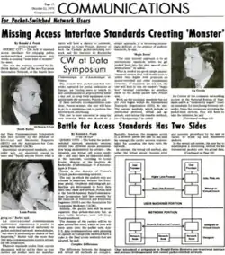 The fourth biennial Data Communications Symposium later that year included presentations from Davies, Pouzin, Derek Barber, and Ira Cotten about the current state of packet-switched networking.[nb 7] The conference was covered by Computerworld magazine which ran a story on the "battle for access standards" between datagrams and virtual circuits, as well as a piece describing the "lack of standard access interfaces for emerging public packet-switched communication networks is creating 'some kind of monster' for users". At the conference, Pouzin said pressure from European PTTs forced the Canadian DATAPAC network to change from a datagram to virtual circuit approach,[36] although historians attribute this to IBM's rejection of their request for modification to their proprietary protocol.[94] Pouzin was outspoken in his advocacy for datagrams and attacks on virtual circuits and monopolies. He spoke about the "political significance of the [datagram versus virtual circuit] controversy," which he saw as "initial ambushes in a power struggle between carriers and the computer industry. Everyone knows in the end, it means IBM vs. Telecommunications, through mercenaries."[75]