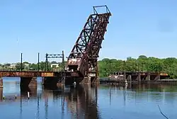 Abandoned Crook Point Bascule Bridge; notice the catenary structures on the span
