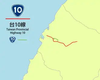 Provincial Highway 10 (PH 10, Chinese: 台10線)is a short east–west highway that is entirely within the city limits of Taichung. The highway connects the Port of Taichung with the northern suburbs of Qingshui, Shalu, Daya, Shengang, and Fengyuan. The total length of the highway is 21.13 kilometres (13.13 mi).[1]