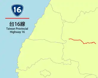 Provincial Highway 16 (Chinese: 台16線) is an East-West highway from Mingjian to Xinyi in Nantou County, Taiwan. The total length of the highway is 41.349 km.[1] A plan to extend the highway for another 96.2 km which will pass through the Central Range was abandoned due to environmental issues and difficulty of construction.