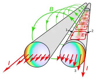 Diagram showing how proximity effect comes about in two parallel wires carrying alternating current (I, red arrows) in the same direction.[1] The magnetic field (B, green lines) of one wire induces circular eddy currents (E) in the other wire. In the drawing the upper section of the righthand wire is removed to show the currents. The eddy current flows in the opposite direction to the main current on the adjacent side of the wire (1) reducing it, but flows in the same direction as the main current on the far side of the wire (2), increasing it. The distribution of current in the wire is illustrated by the arrows and color gradient shown on the cross section (3), with blue indicating areas of low current, and green, yellow, and red progressively higher current.