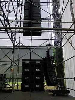 Touring productions travel with relocatable large line-array PA systems, sometimes rented from an audio equipment hire company. The sound equipment moves from venue to venue along with various other equipment such as lighting and projection.