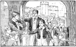 The 19th-century public school ethos promoted ideas of service to Crown and Empire,[142] exemplified in tropes such as "Play up! Play up! And play the game!" from Henry Newbolt's 1892 poem Vitaï Lampada and "the Battle of Waterloo was won on the playing fields of Eton", the latter popularly attributed to the Duke of Wellington.[143] Many ex-pupils, like those from other schools, had, and still have, a nostalgic affection for their old schools (George Orwell remembered being "interested and happy" at Eton,[144]) and a public school tie and an "old boy network" of former pupils were useful in advancing a career.[145] The English public school model influenced the 19th-century development of Scottish elite schools, but a tradition of the gentry sharing their primary education with their tenants kept Scotland more egalitarian.[146][147]