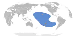 The Christmas shearwater nests on remote islands of the Central Pacific: the Northwestern Hawaiian Islands, Tuamotu, the Marshall Islands, Kiritimati (for which the species is named) and Sala-y-Gómez. It has become locally extinct on a number of islands, including Wake Island. Outside of the breeding season it ranges across the Pacific, having been recorded off the coast of Mexico and Guatemala in the east, and Bonin Islands in the west. Further south it is rare, having been recorded off Fiji only twice (one time in early to mid-May).[7]