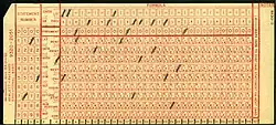 Hollerith envisioned a number of card sizes. In an article he wrote describing his proposed system for tabulating the 1890 U.S. census, Hollerith suggested a card 3 by 5+1⁄2 inches (7.6 by 14.0 cm) of Manila stock "would be sufficient to answer all ordinary purposes."[41] The cards used in the 1890 census had round holes, 12 rows and 24 columns. A reading board for these cards can be seen at the Columbia University Computing History site.[42] At some point, 3+1⁄4 by 7+3⁄8 inches (83 by 187 mm) became the standard card size. These are the dimensions of the then-current paper currency of 1862–1923.[43] This size was needed in order to use available banking-type storage for the 60,000,000 punched cards to come nationwide.[42]