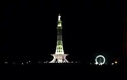 Eid-e-Milad-un- Nabi is an Islamic festival in honour of the birthday of Muhammad.[8] The festival is observed in the third month of the Islamic lunar calendar called Rabi'al-Awal.[9] Various processions take place in Lahore to celebrate the festival.[10] According to Nestorovic (2016), hundreds of thousands of people gather at Minare-Pakistan, Lahore, between the intervening night of 11th and 12th Rabi' al-awwal of the Islamic calendar.[11] The festival was declared a national holiday in Pakistan in 1949.[12] |