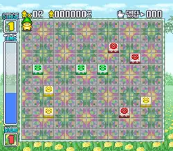 The main objective of the game is to push boxes to make a group of 3 boxes.[2] Once the group is made, the boxes will pop out. When all the boxes disappear, the game moves onto the next stage. If a player makes any mistakes, they can press L+R that plays a jingle and the screen will fade to white before resetting the stage.