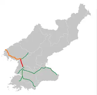 The Pyongyang–Sinŭiju Motorway (Korean: 평양신의주고속도로) is a motorway in North Korea under construction, which will be built parallel to the Pyongyang–Sinŭiju line and will connect Pyongyang with Sinŭiju. The Chinese border city Dandong is to be reached via Sino-Korean Friendship Bridge. The Pyongyang–Sinŭiju Expressway is said to be 387.1 kilometers long.