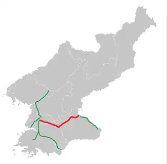 The Pyongyang–Wonsan Tourist Motorway (Korean: 평양원산관광도로) is a 172-kilometre-long highway (107 mi) in North Korea that connects the cities of Pyongyang, the capital of the country, and Wonsan, a city on the coast of the Sea of Japan in the province of Kangwon. The expressway opened in 1978.[1] The highway became North Korea's first toll road in 2018.[2]