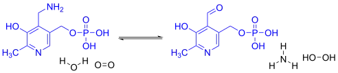 Pyridoxine 5′-phosphate oxidase catalyzes several reactions; the two most important are the deamination of pyridoxamine 5′-phosphate and the dehydrogenation (oxidation) of pyridoxine 5-phosphate, both of which are key intermediates in the metabolism of B6.[8] Pyridoxine 5′-phosphate oxidase's EC number is 1.4.3.5.[6]