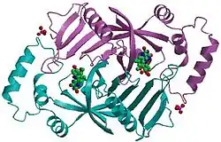 Pyridoxine 5′-phosphate oxidase is an enzyme, encoded by the PNPO gene,[1][2][3] that catalyzes several reactions in the vitamin B6 metabolism pathway. Pyridoxine 5′-phosphate oxidase catalyzes the final, rate-limiting step in vitamin B6 metabolism, the biosynthesis of pyridoxal 5′-phosphate, the biologically active form of vitamin B6 which acts as an essential cofactor.[4] Pyridoxine 5′-phosphate oxidase is a member of the enzyme class oxidases, or more specifically, oxidoreductases. These enzymes catalyze a simultaneous oxidation-reduction reaction. The substrate oxidase enzymes is hydroxylated by one oxygen atom of molecular oxygen.[5] Concurrently, the other oxygen atom is reduced to water. Even though molecular oxygen is the electron acceptor in these enzymes' reactions, they are unique because oxygen does not appear in the oxidized product.