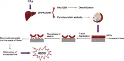 PAs are metabolized in the liver through CYP450-mediated pathways. This metabolic process leads to the formation of reactive intermediates, such as pyrrolic metabolites, which can covalently bind to proteins in the liver, forming pyrrole-protein adducts. These adducts impair the function of essential liver proteins, leading to hepatotoxicity. The severity of liver damage correlates with the level of pyrrole-protein adduct formation. Hepatotoxicity induced by PAs can manifest as liver injury, inflammation, necrosis, HSOS (Hepatic Sinusoidal Obstruction Syndrome) and even liver failure in severe cases.[16][28] The pathogenesis of PAs-induces HSOS is shown by Xu.
