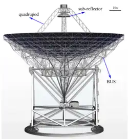 The QTT is a Gregorian parabolic antenna with an active main surface to correct the deformation caused by gravity. The antenna has an azimuth-elevation structure on a wheel-and-track mount. The back of the antenna has design similarities to the umbrella-like structure of the Eiffelsberg telescope. To reduce dead load and thermal deformation, the sub-reflector will use carbon fiber-reinforced plastic. The telescope can switch between Gregorian and primary focus. For the primary focus it uses the prime focus platform (PEP). The PEP is aligned to one of the quadruple legs in stow mode and it is moved horizontally over the sub-reflector in primary operation mode. The PEP contains receivers and auxiliary equipment. To access the telescope an elevator, stairs, catwalks, platforms and a crane is part of the antenna.[2]