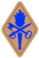 Shoulder Sleeve Insignia is a buff rounded lozenge, 2 inches by 3 inches with a blue torch with blue flames and a crossed blue key and sword. The shoulder sleeve insignia was originally approved for the Quartermaster Training Command on 7 Nov 1956. On 24 Nov 1975 the insignia was amended to reverse the colors of the insignia.
