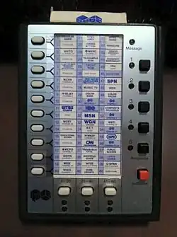 In the middle of these three rows of buttons was a clear plastic window that held a channel card with station names and logos arranged in a grid corresponding to the ten "row" buttons on the left and the three "column" buttons along the bottom. Channel cards were mailed to customers with each change in the channel line-up. Customers would remove the old guides and slide in the new ones.