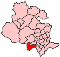 The village was divided between the township of Clayton in the parish of Bradford, and the township of Northowram in the parish of Halifax, both in the West Riding of Yorkshire.[3] It became a civil parish and urban district in 1894. In 1937 the civil parish was abolished, and the urban district was merged into the new Queensbury and Shelf Urban District. In 1974, the urban district was split; Queensbury was transferred to the City of Bradford in the new county of West Yorkshire.