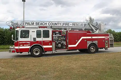 A quintuple combination pumper or quint is a fire-fighting apparatus that serves the dual purpose of an engine and a ladder truck. "Quintuple" refers to the five functions that a quint provides: pump, water tank, fire hose, aerial device, and ground ladders.[1] Tillers and tractor-drawn aerials also have quint features, and are dubbed "quillers".