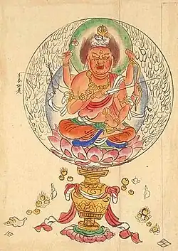 Rāgarāja, also known as Aizen-Myōō, is one of many Wisdom kings, (but not in the traditional grouping of the five great Myoo, or Godai Myoo) Wisdom Kings like Acala (Fudo-Myōō). There are four different mandalas associated with Rāgarāja: The first posits him with thirty-seven assistant devas, the second with seventeen. The other two are special arrangements: one made by Enchin, fourth Tendai patriarch; the other is a Shiki mandala which represents deities using their mantra seed syllables drawn in bonji. Rāgarāja is also depicted in statuary and thangka having two heads: Rāgarāja and Acala or Rāgarāja and Guanyin, both iterations symbolizing a commingling of subjugated, complementary energies, typically male/female but also male/male. There are two, four or six armed incarnations of Rāgarāja but the six-armed one is the most common. Those six arms bear a bell which calls one to awareness; a vajra, the diamond that cuts through illusion, an unopened lotus flower representing the power of subjugation, a bow and arrows (sometimes with Rāgarāja shooting the arrow into the heavens), and the last one holding something that we cannot see (referred to by advanced esoteric practitioners as "THAT".)[1] Rāgarāja is most commonly depicted sitting in full lotus position atop an urn that ejects jewels showing beneficence in granting wishes.