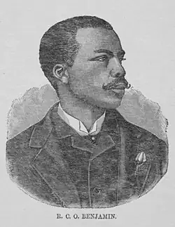 R. C. O. Benjamin (né Robert Charles O'Hara Benjamin; March 31, 1855 – October 2, 1900) was a West Indies-born American journalist, lawyer, and minister. He was an editor or contributor to numerous newspapers throughout the country, and may have been the first black editor of a white paper when he became editor of the Daily Sun In Los Angeles, California. He was also possibly the first black man admitted to the California bar, and may have been admitted to the bar in twelve states. In 1900 he was working as a prominent lawyer in Lexington Kentucky when he was beaten for helping register black voters by a white man who opposed his efforts. Later that day he was killed by the same man.