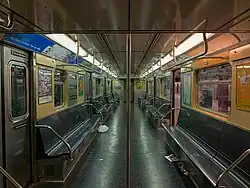 The R32 contract was divided into two subcontracts of 300 cars each: R32 (cars 3350–3649) and R32A (cars 3650–3949).[4] The R32As were funded through the proceeds of a revenue bond, while the R32s were paid for out of the 1963–1964 New York City capital budget. The two subcontracts differed with the first 150 R32s (3350–3499) having visible bulkhead horns; these were the last cars to be built with this feature.[5][6] This feature can also be found on the Redbirds, R27s, and R30s, along with various older trains. Another distinctive difference was the interior lighting featuring backlit ad-signs on R32A cars 3800–3949.[7][8]
